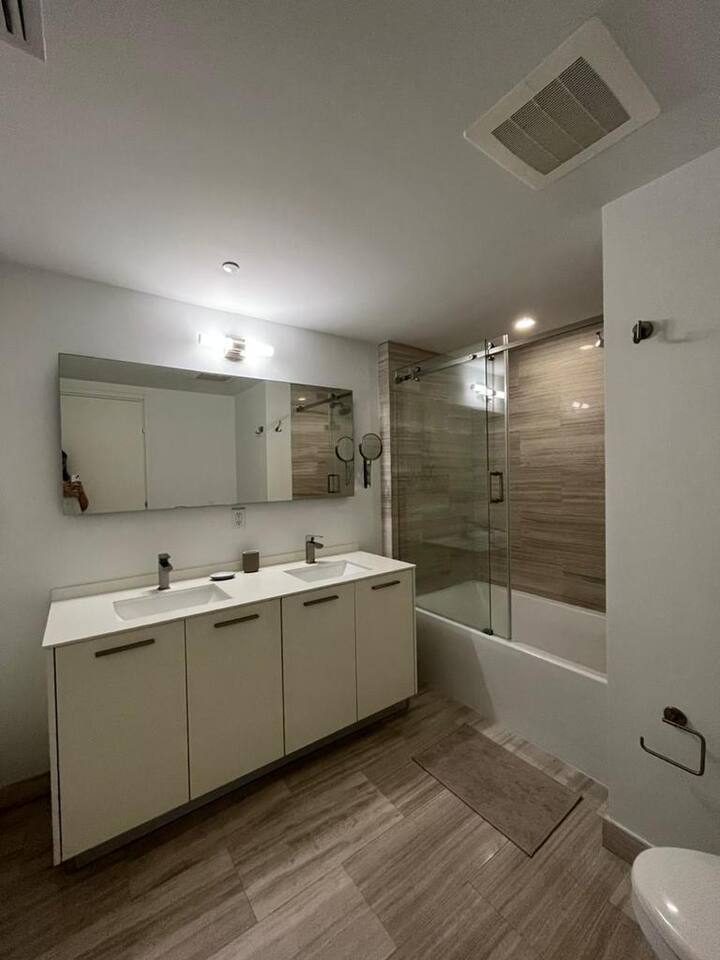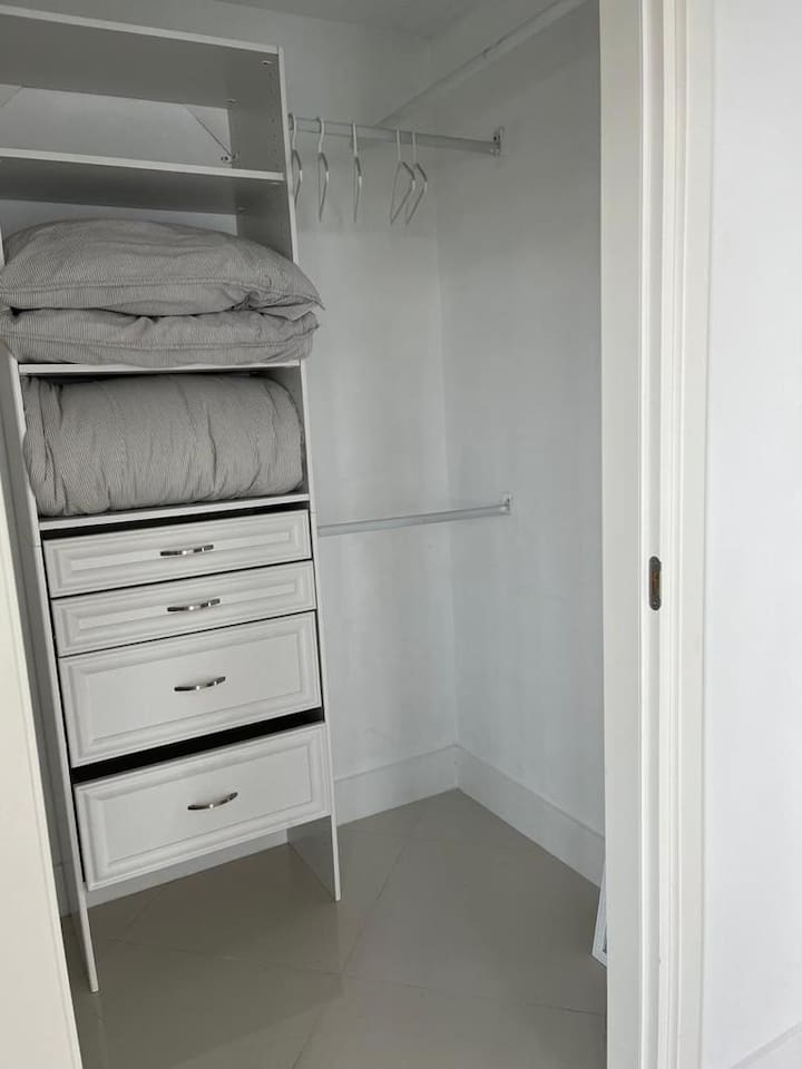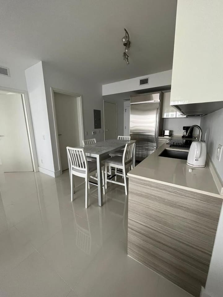 The apartment features a sleeper sofa in the living room, as well as a comfortable king-sized bed in the bedroom. Guests can enjoy stunning city and partial ocean views from the balcony and bedroom. The property has a fully equipped kitchen with everything needed to prepare meals. There is a dining area with a table and chairs, as well as a living room with a sofa and a smart TV. The unit also has a washer and dryer, making it easy to keep clothes clean during the stay. The condominium offers a variety of services for guests, including two outdoor pools, one of which is located on the rooftop, a well-equipped gym, and a BBQ area. In addition, guests have access to free covered parking and free Wi-Fi throughout the apartment. The apartment also includes a large walk-in closet for storing clothes and other personal items. The location of the condominium is ideal for those looking to explore the vibrant Brickell neighborhood. There are many restaurants, bars, and trendy shops within walking distance, and the property is conveniently located near several public transportation options. Overall, this Airbnb listing offers a comfortable and well-equipped stay in one of Miami's most popular areas. Additionally, our apartment also includes a parking spot for one car, providing added convenience and security for our guests. Guests can park their car in a safe and convenient spot, allowing them to enjoy all that Miami has to offer without worries.